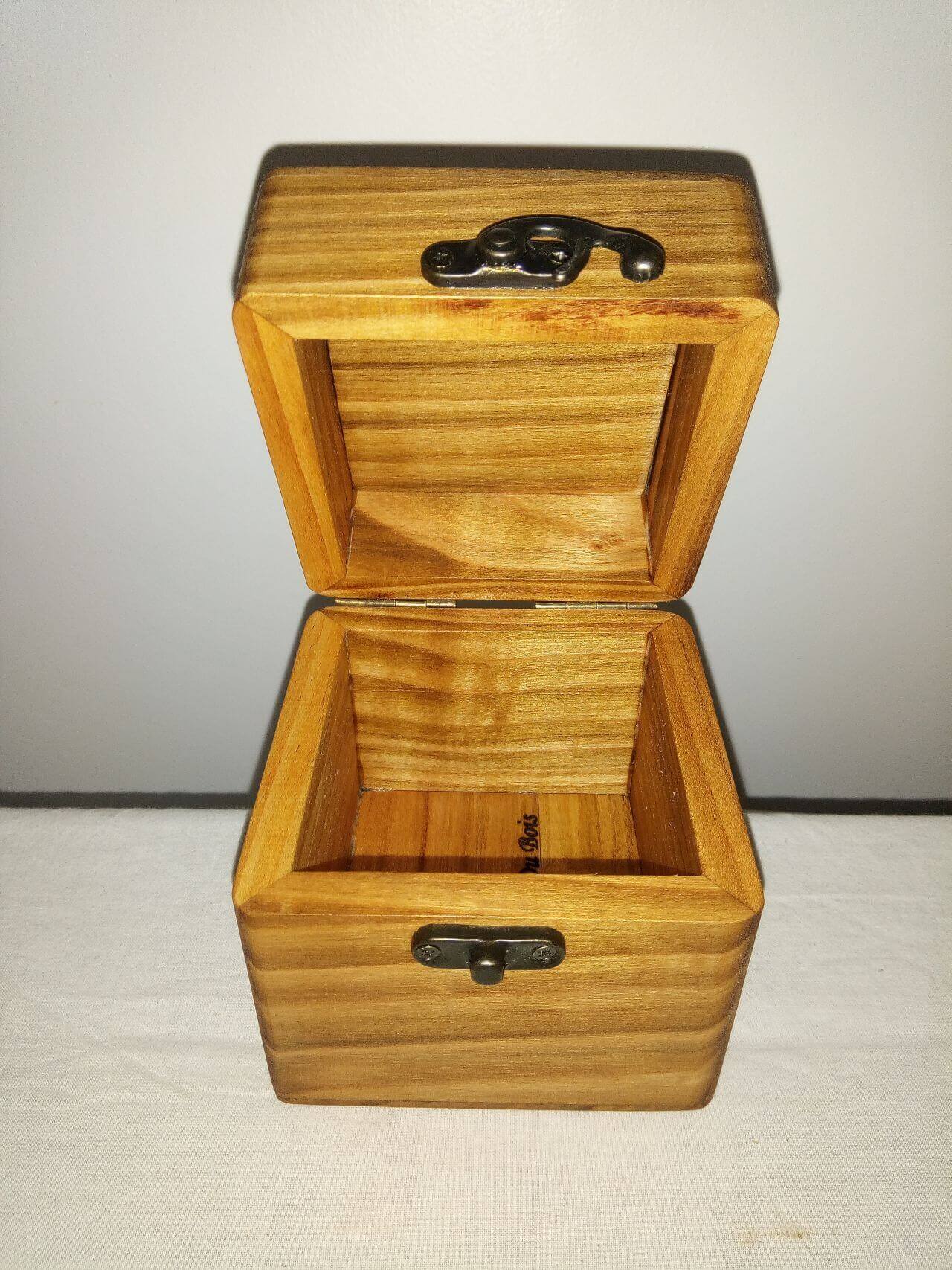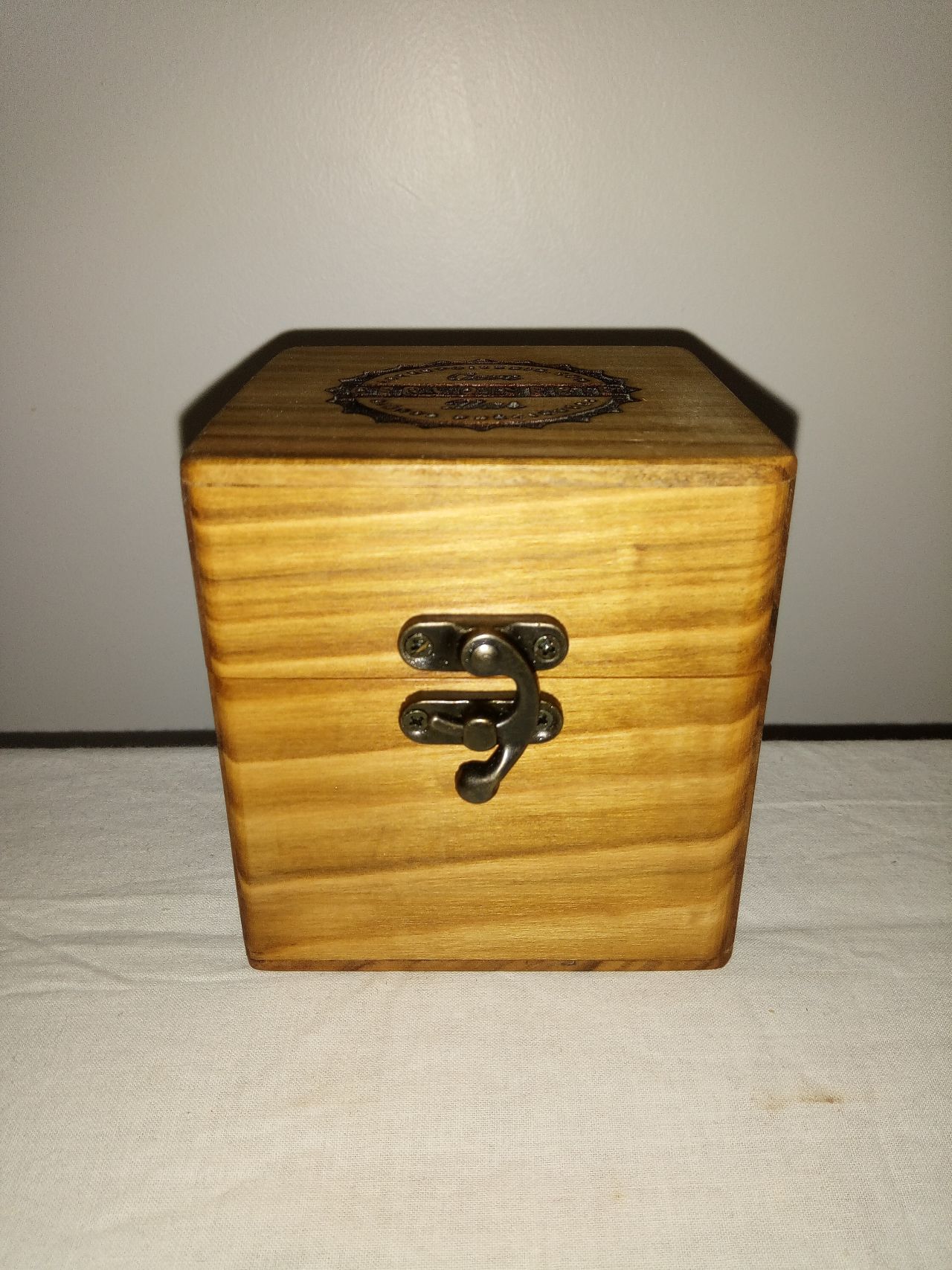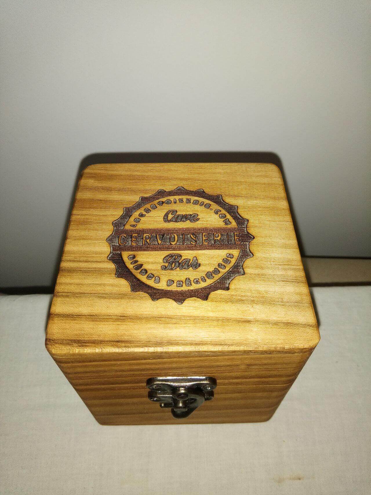 Coffret en merisier 95 x 95 x 100 mm. Finition huile de bois de rose. Avec le logo de la Cervoiserie graver au laser dessus